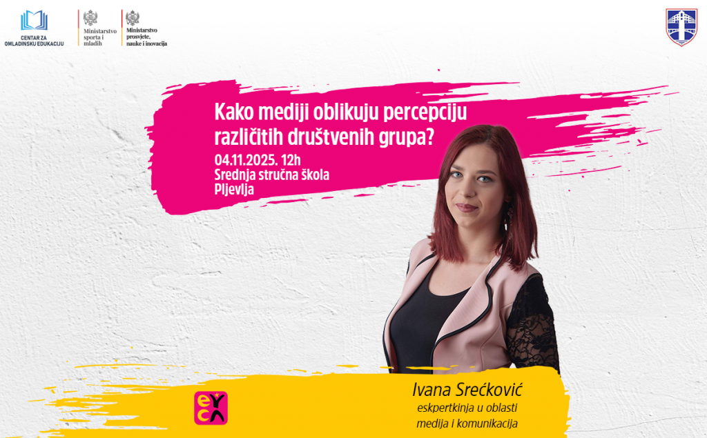 Радионицу на тему медијске писмености одржаће у Средњој стручној школи Пљевља 4. новембра 2025. год. Ивана Срећковић, експерт из области медија. На њој ће бити ријечи о медијском простору у 21. вијеку и могућим видовима разликовања лажне од праве вијести кроз репрезентацију различитих друштвених група у медијима.