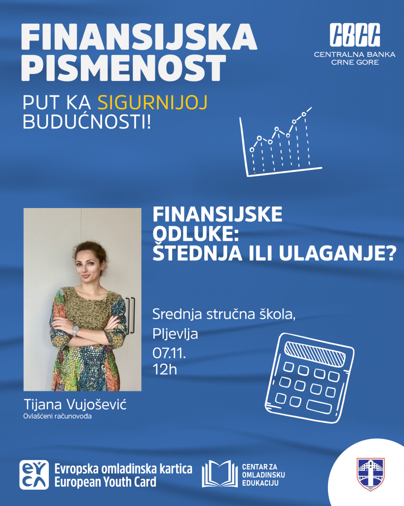 Радиницу на тему финансијске писмености држаће Тијана Вујошевић, рачуновођа, 7. новембра 2025. године. Ученици ће добити прилику да кроз практичне савјете науче како располагати новцем, како штедјети, и како употребом дигиталних алата олакшати себи улазак у свијет финансија.